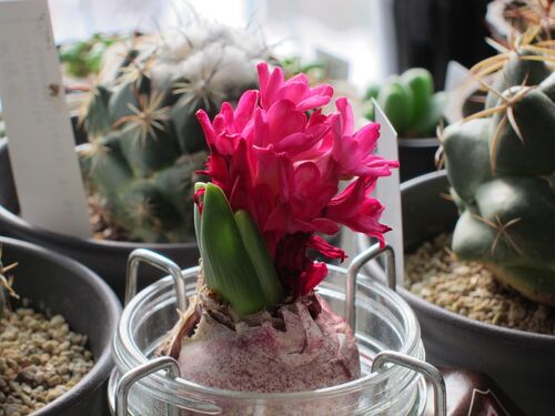 ヒヤシンスの水栽培… 根が出て、緑色の芽が出た…までは良かったのだけれど、葉も茎もそんなに伸びず、ちんまりと咲き始めてしまいました。 冷暗所で根出しをしたのだけど室温が高すぎたのかな。 一気に初夏を感じて咲いちゃったのだろうか。 (^-^; 小学生の…