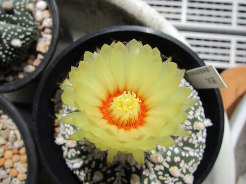 秋のシーズンなのでしょうか。 今度は、兜丸(Astrophytum asterias)さんが、今年2回目の花を咲かせてくださいました。 黄色で底赤の花はきれいです。 アストロフィツムは開く、閉じるを繰り返すのでお昼、正午くらいが見頃になります。 棘が無いし、見た目…