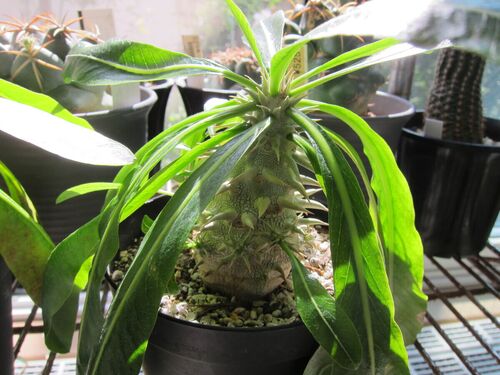 まだ、陽が当たれば20度にはなるのですが、最低気温が10度に限りなく近くなりましたので パキポディウムを家の中に取り込みました。 葉が落ちてから取り込もうと思ってたのですが、 恵比寿大黒(Pachypodium densicaule)葉が萎れてきました。 もともと処分…